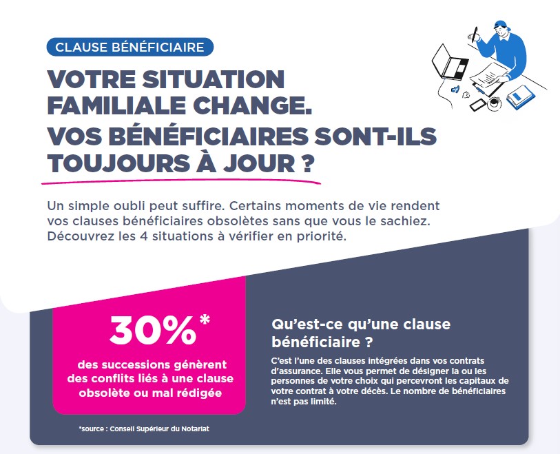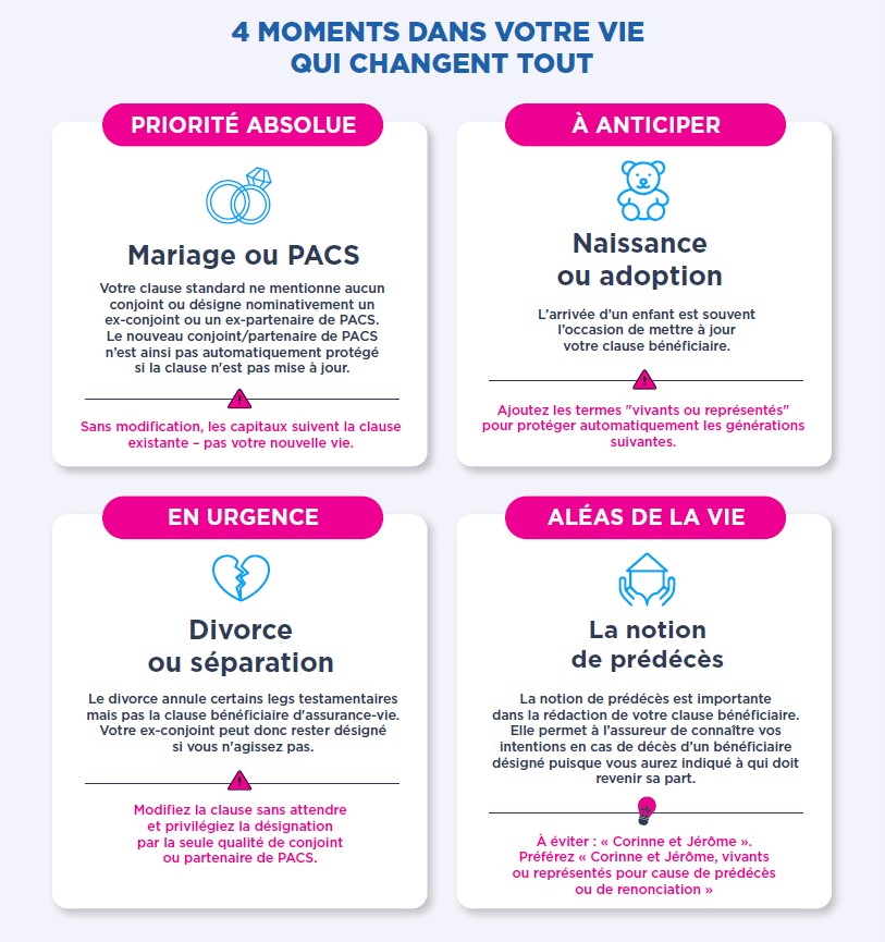 Certains moments de vie rendent vos clauses bénéficiaires obsolètes sans que vous le sachiez. Découvrez sans attendre les 4 situations à vérifier en priorité grâce à notre infographie.